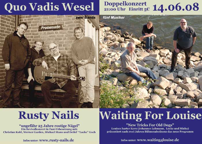 Frische Fotos wurden für das Plakat zum Doppelkonzert mit den wieder auferstandenen "Fast-Ur-Rusties" verwendet. Das Plakat hält auch nicht damit hinter dem Berg, dass 66% von Louise identisch mit 50% der Rostigen Nägeln sind. Auch wenn es wohl den einen oder anderen verwirrt haben könnte, dass die insgesamt sieben Musiker der zwei Bands im Grunde nur fünf verschiedene Musiker waren. Der besondere Konzertanlass bot auch mal einen anderen Designstil an.